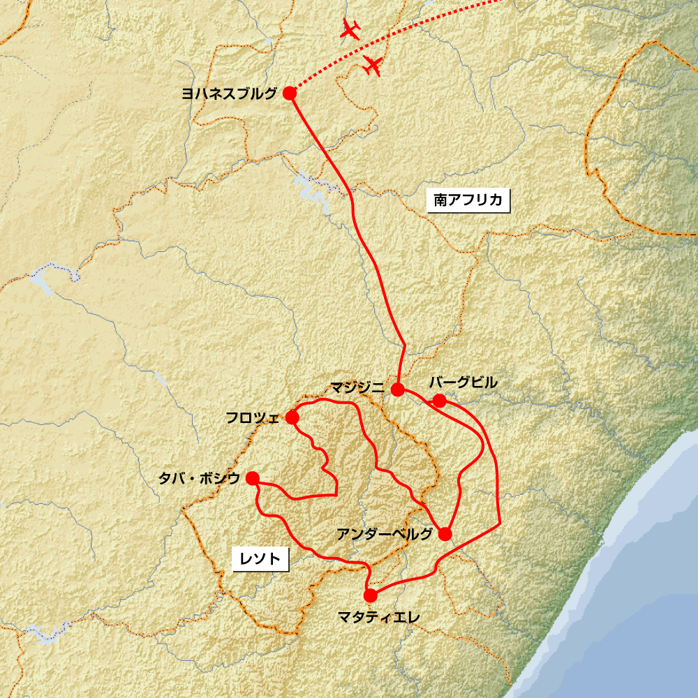 国土全域がドラケンスバーグ山脈の山中に位置し、全土の平均標高が1400mを超える「天空の王国」レソトを走る2026年新コース。南アフリカのヨハネスブルグをスタートし、ドラケンスバーグ山脈の山容を眺めながらアンダーベルグへ。ここから約1300mの標高差を誇るサニ・パスを駆け上がります。その後、レソトの山々に続く爽快なワインディングルートを駆け抜け、レソト文化も体験しながら、セモンコンでは落差192mのマレツニャーネの滝も訪問。清々しく爽やかな空気に包まれた絶景の中を走るオン&オフロードツーリングです。