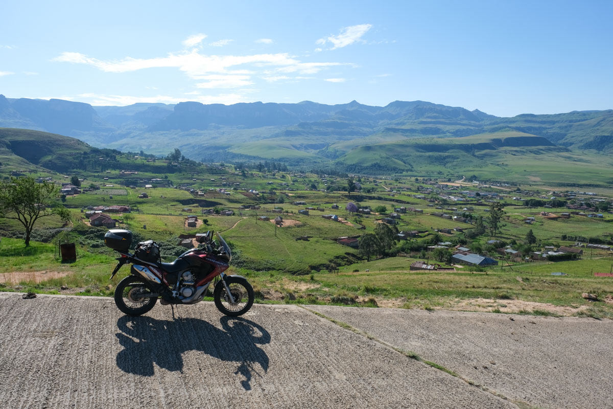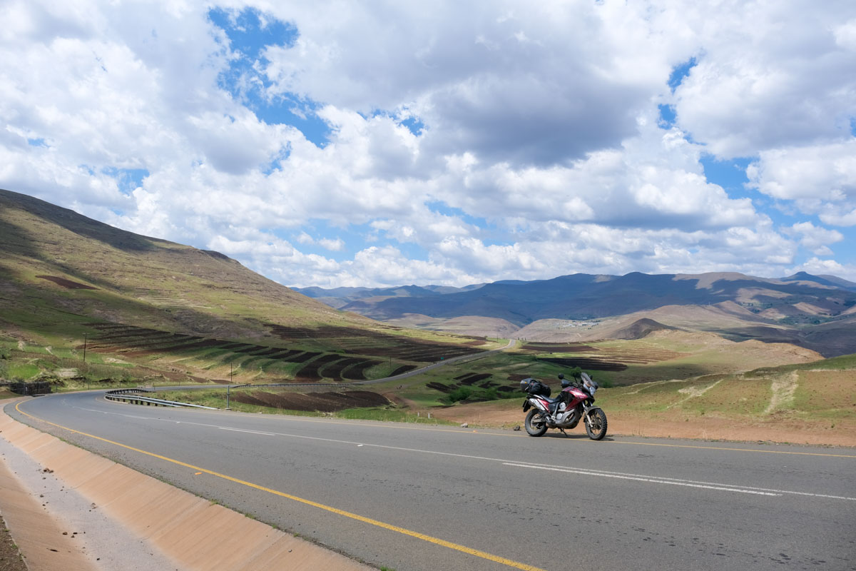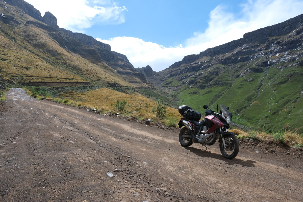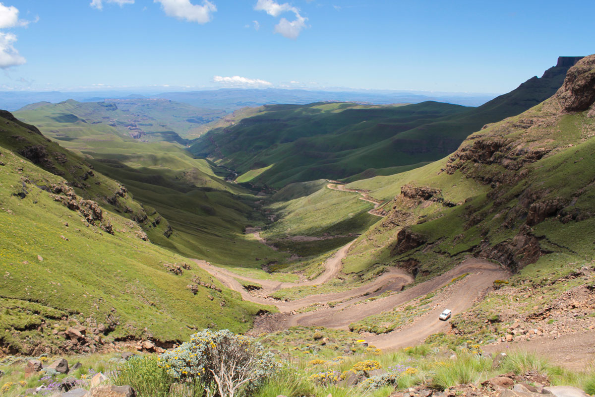 アンダーベルグから南アフリカ出国手続き後、サニ・パスを駆け上がります。ロッキーなダートと後半は急登のヘアピンが続きます。レソト入国後、山間に続く気持ちのよいワインディングを駆け抜けフロツェへ。