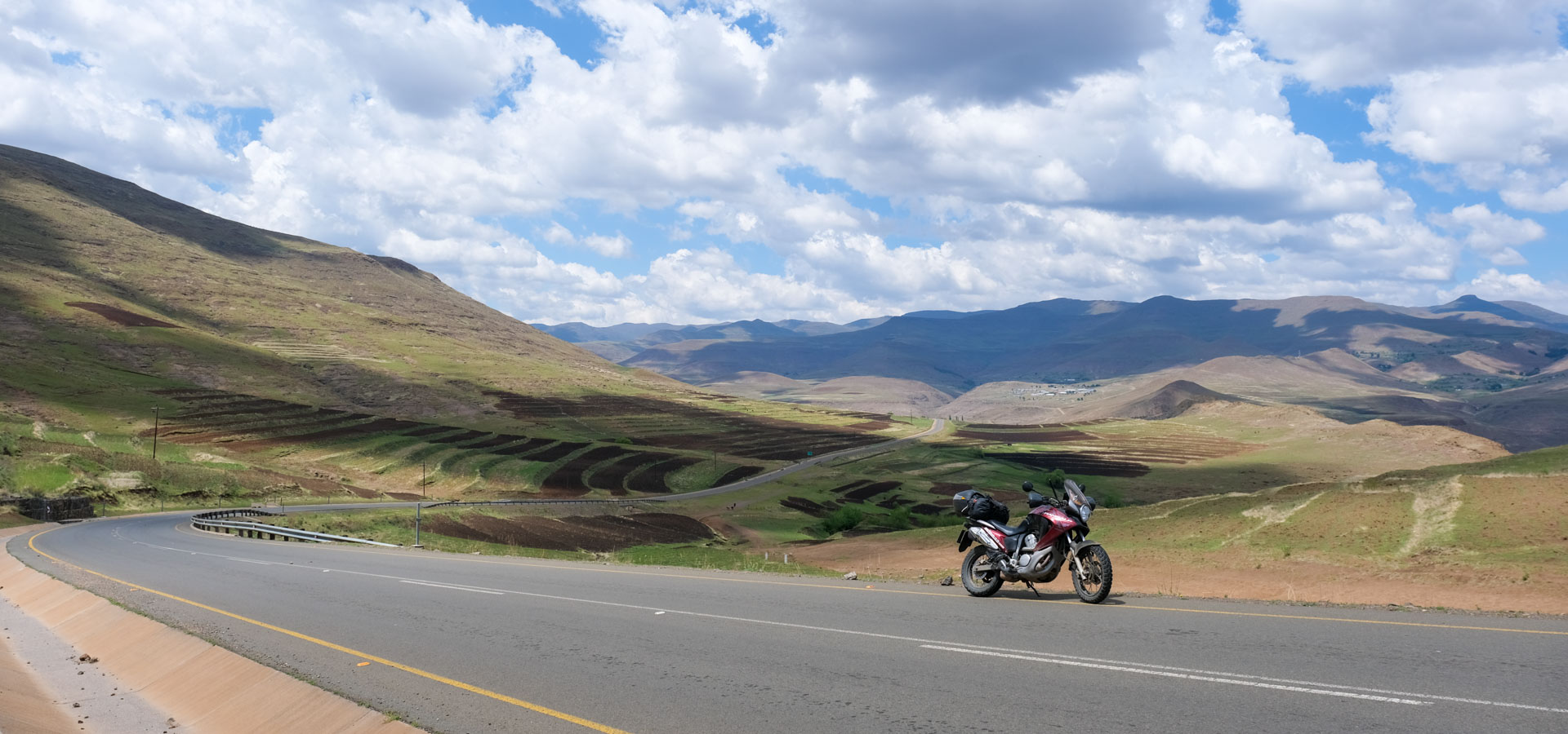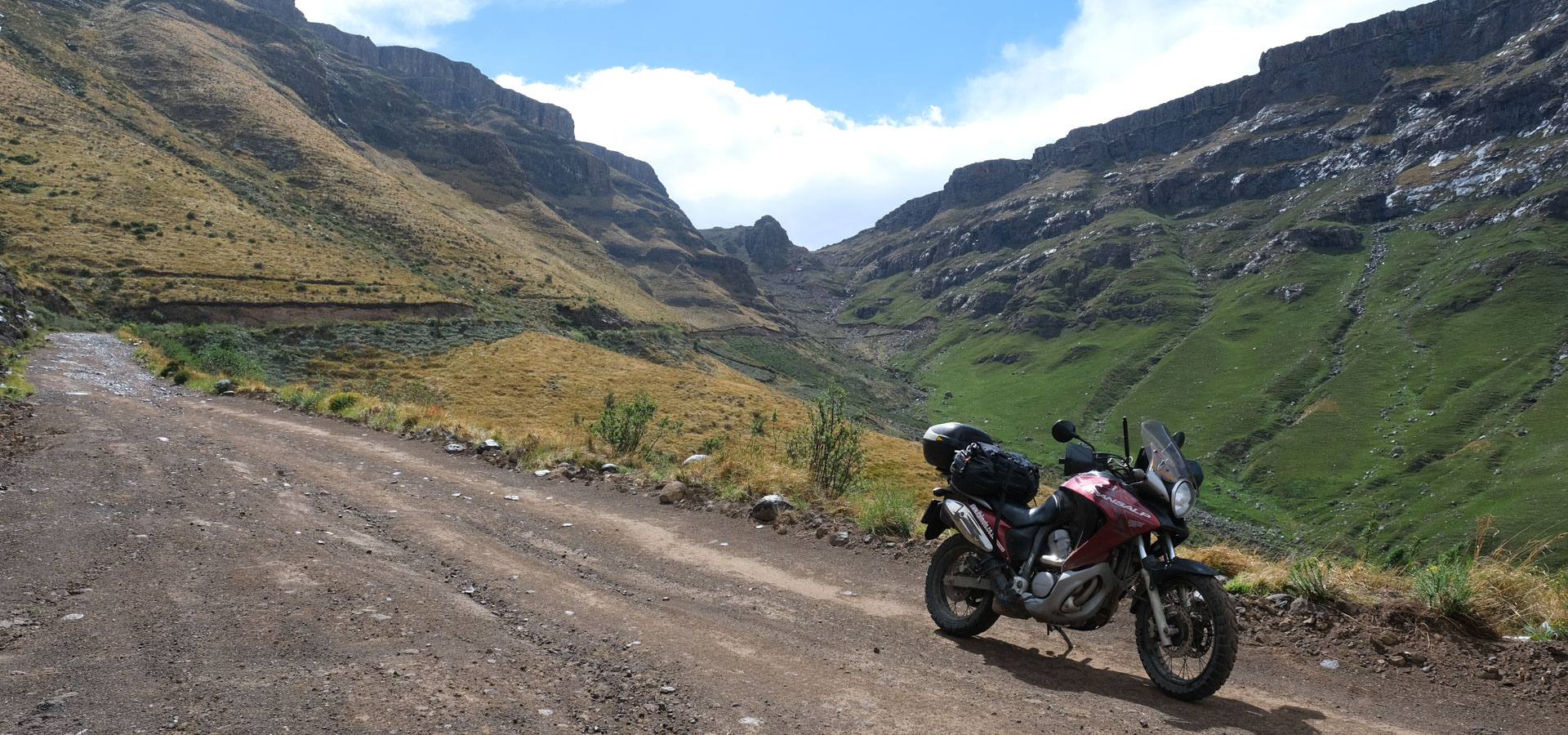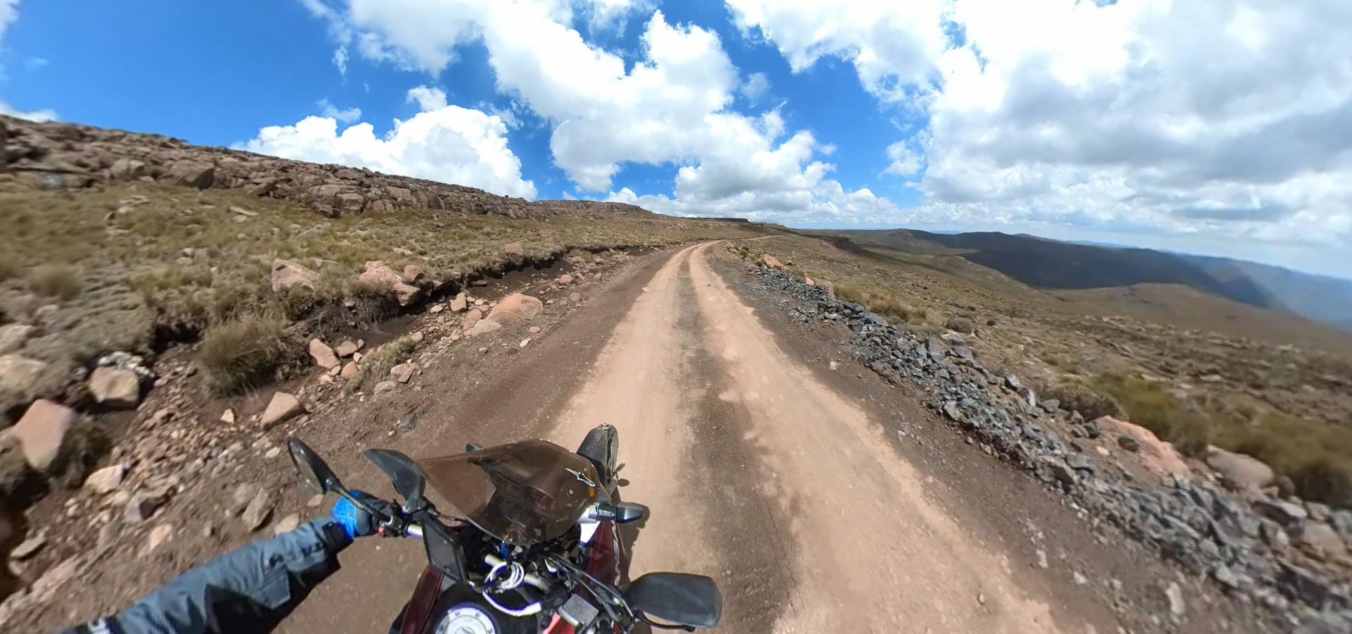 アンダーベルグから南アフリカ出国手続き後、サニ・パスを駆け上がります。ロッキーなダートと後半は急登のヘアピンが続きます。レソト入国後、山間に続く気持ちのよいワインディングを駆け抜けフロツェへ。