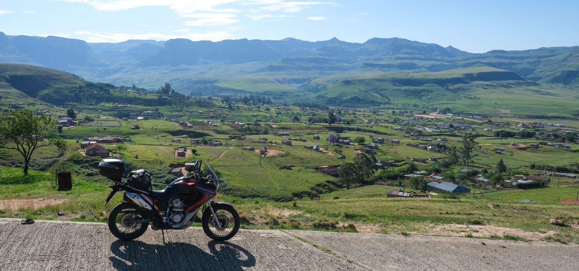 朝食後、右手にドラケンスバーグ山脈を眺めながらローカルルートを走ります。その後、のどかな風景の中、牧場を駆け抜けるフラットダートを満喫します。
